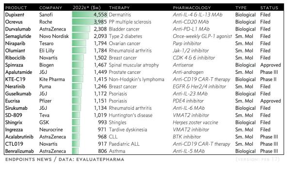 位列榜單前三甲的分別是:賽諾菲和再生元的IL-4受體阻斷劑Dupixent、羅氏的抗CD20單抗Ocrevus、阿斯利康的PD-L1免疫療法Durvalumab,這3個藥物在2022年的預計銷售額將分別達到46億美元、40億美元、23億美元。