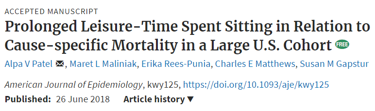 6月26日,這一成果以“Prolonged Leisure-Time Spent Sitting in Relation to Cause-specific Mortality in a Large U.S. Cohort”為題發表在American Journal of Epidemiology雜志上。